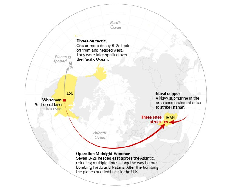 Για να καλύψει τον πραγματικό στόχο της αποστολής, δύο ομάδες βομβαρδιστικών B-2 απογειώθηκαν ταυτόχρονα από το Μιζούρι, σύμφωνα με τους New York Times.
