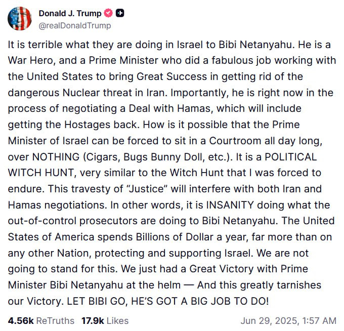 Ο Τραμπ δεν έμεινε εκεί: Σύνδεσε την αμερικανική βοήθεια προς το Ισραήλ με τη νομική του υπόθεση, λέγοντας ότι η Αμερική «δεν θα ανεχθεί» τέτοια μεταχείριση αφού έχει δώσει «δισεκατομμύρια δολάρια» στη χώρα.