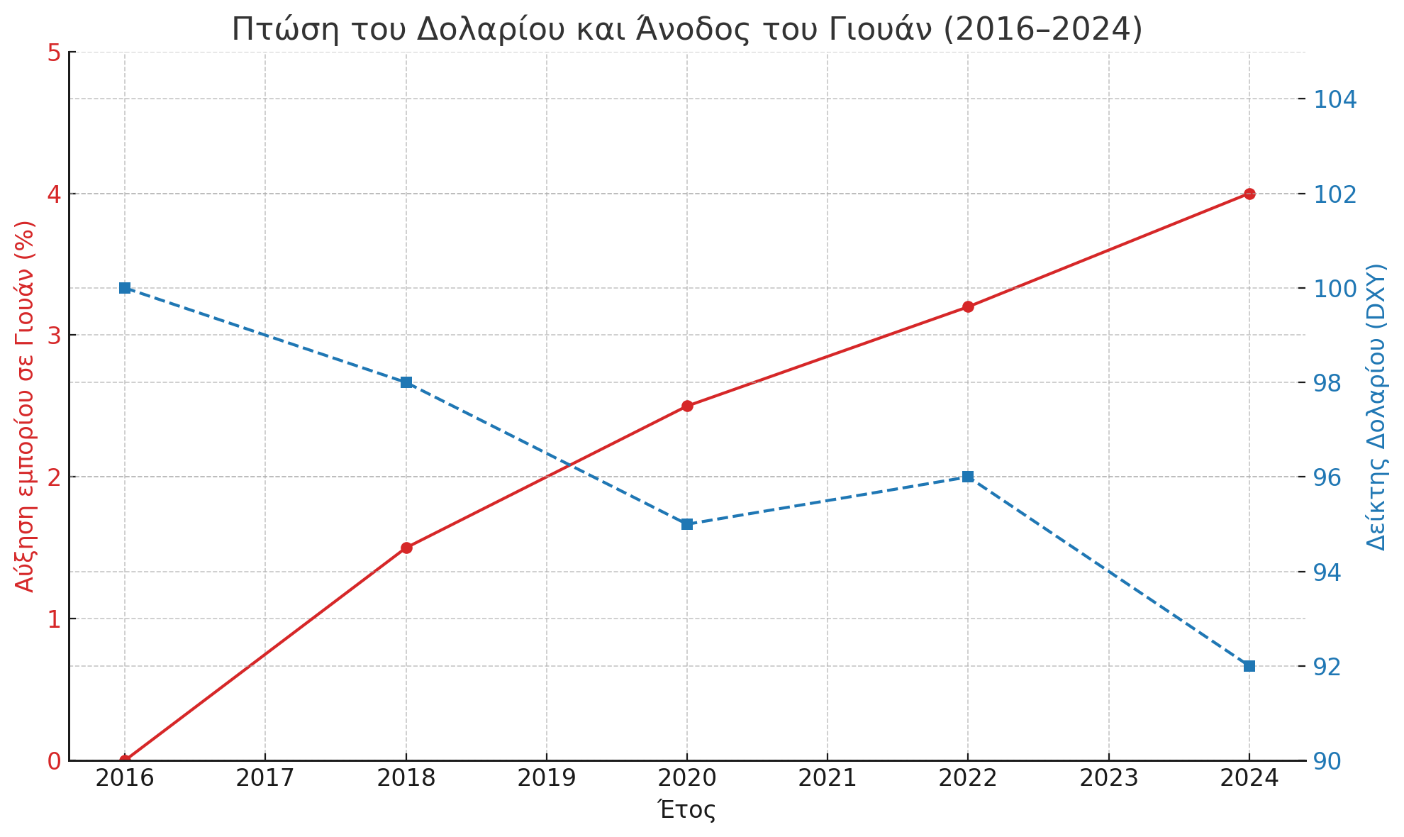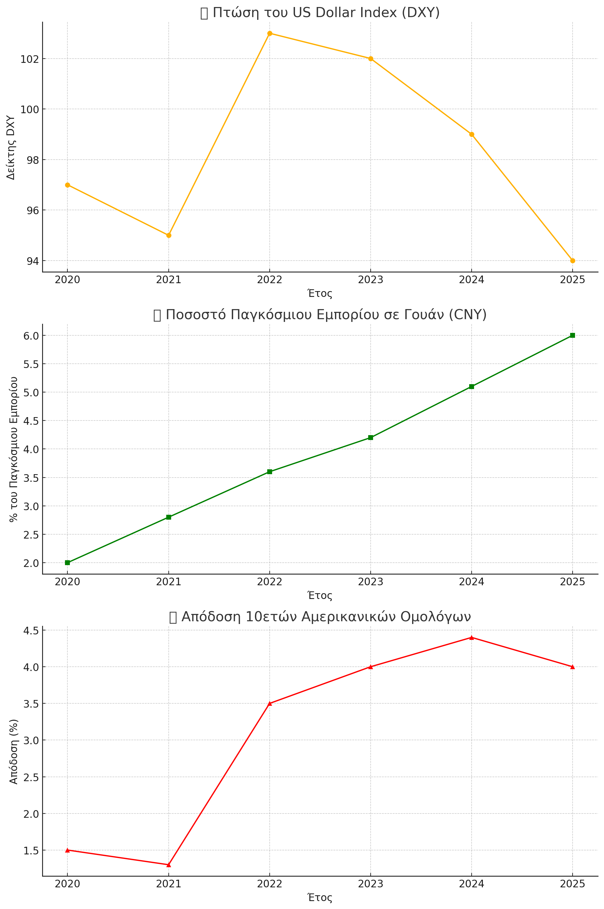- Πτώση του US Dollar Index (DXY): Φαίνεται ότι η ισχύς του δολαρίου υποχωρεί σταθερά από το 2022.