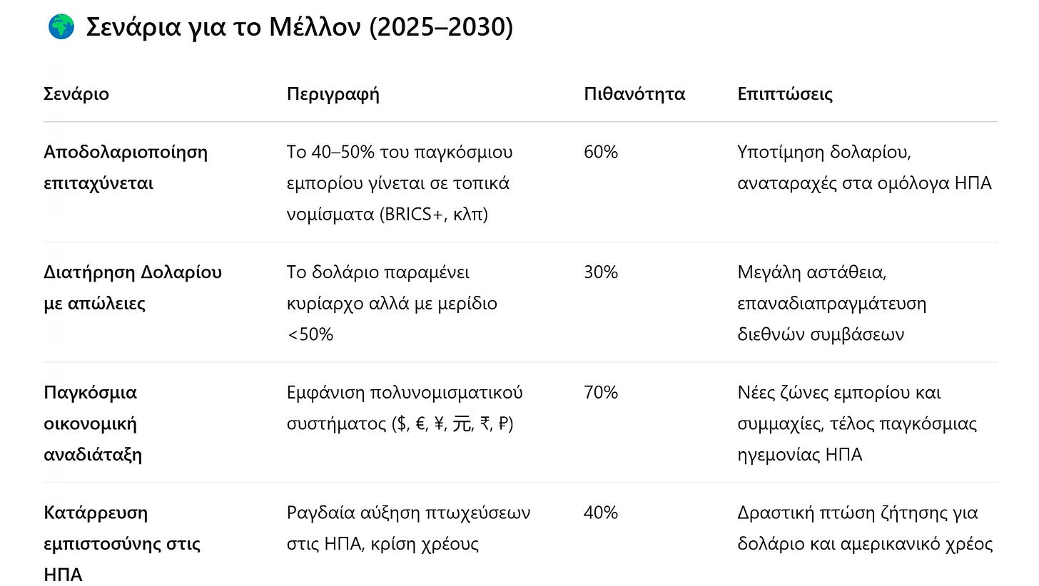 ➔ Συμπέρασμα: Το φαινόμενο της αποδολαριοποίησης επιταχύνεται — και οι τελευταίοι εμπορικοί πόλεμοι το σπρώχνουν ακόμα πιο γρήγορα.