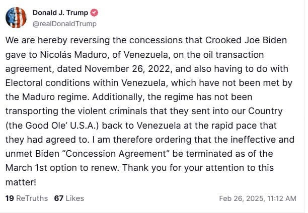 🛢 Ο Τραμπ ανακαλεί την άδεια της Chevron για εξόρυξη πετρελαίου στη Βενεζουέλα, επικαλούμενος την αποτυχία του Μαδούρο να τηρήσει τις υποσχέσεις του για την επαναπροώθηση μεταναστών.