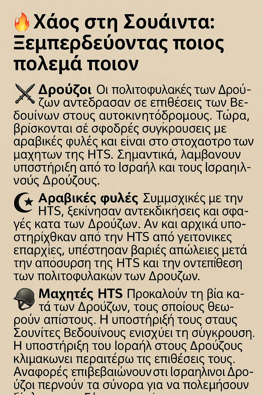 ⚔️Δρούζοι: Οι πολιτοφυλακές των Δρούζων αντέδρασαν σε επιθέσεις των Βεδουίνων στους αυτοκινητόδρομους. Τώρα, βρίσκονται σε σφοδρές συγκρούσεις με αραβικές φυλές και είναι στο στόχαστρο των μαχητών της HTS. Σημαντικά, λαμβάνουν υποστήριξη από το Ισραήλ και τους Ισραηλινούς Δρούζους.