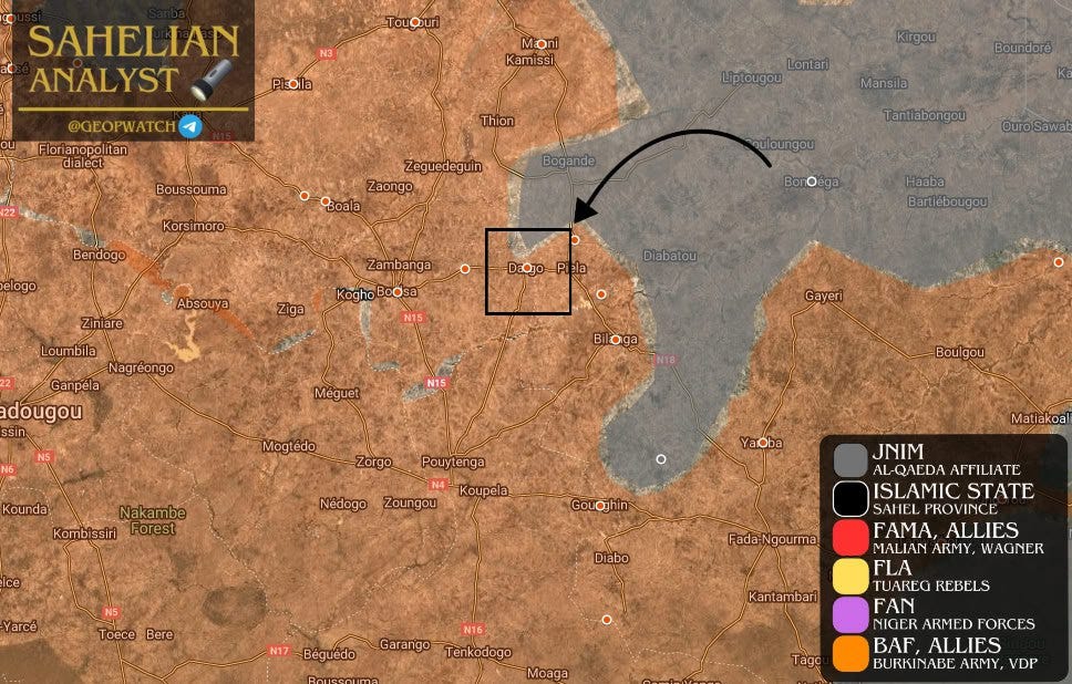 ➡️ Στις 28 και 29 Ιουλίου, μαχητές της JNIM επιτέθηκαν σε θέσεις του στρατού στην πόλη Ντάργκο, στην βοριοανατολική Μπουρκίνα Φάσο (επαρχία Boulsa), σκοτώνοντας έως και 50 στρατιώτες και καταλαμβάνοντας δεκάδες όπλα και 9 μοτοσικλέτες.
