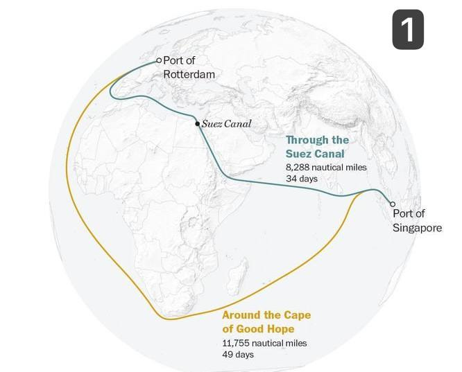 🔹 Διέρχεται από τη Διώρυγα του Σουέζ, που ενώνει τη Μεσόγειο με την Ερυθρά Θάλασσα.
