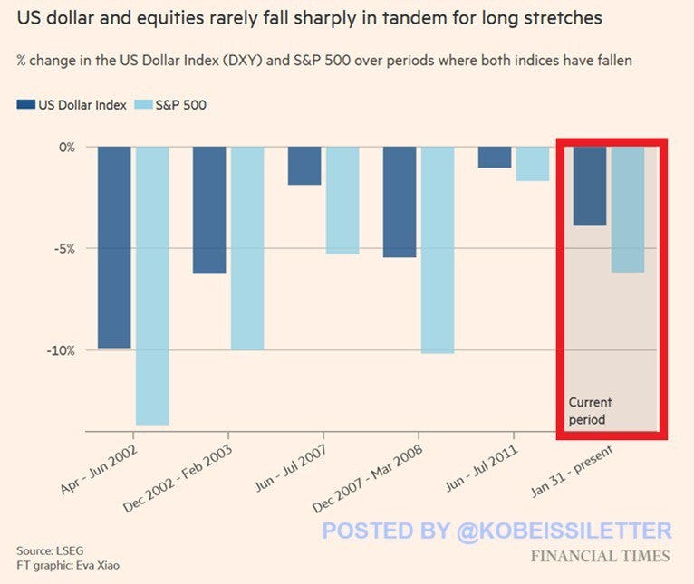 Αυτό έχει συμβεί ελάχιστες φορές στο παρελθόν. Η τελευταία φορά που οι μετοχές και το δολάριο υποχώρησαν ταυτόχρονα με παρόμοια ένταση ήταν το 2008.