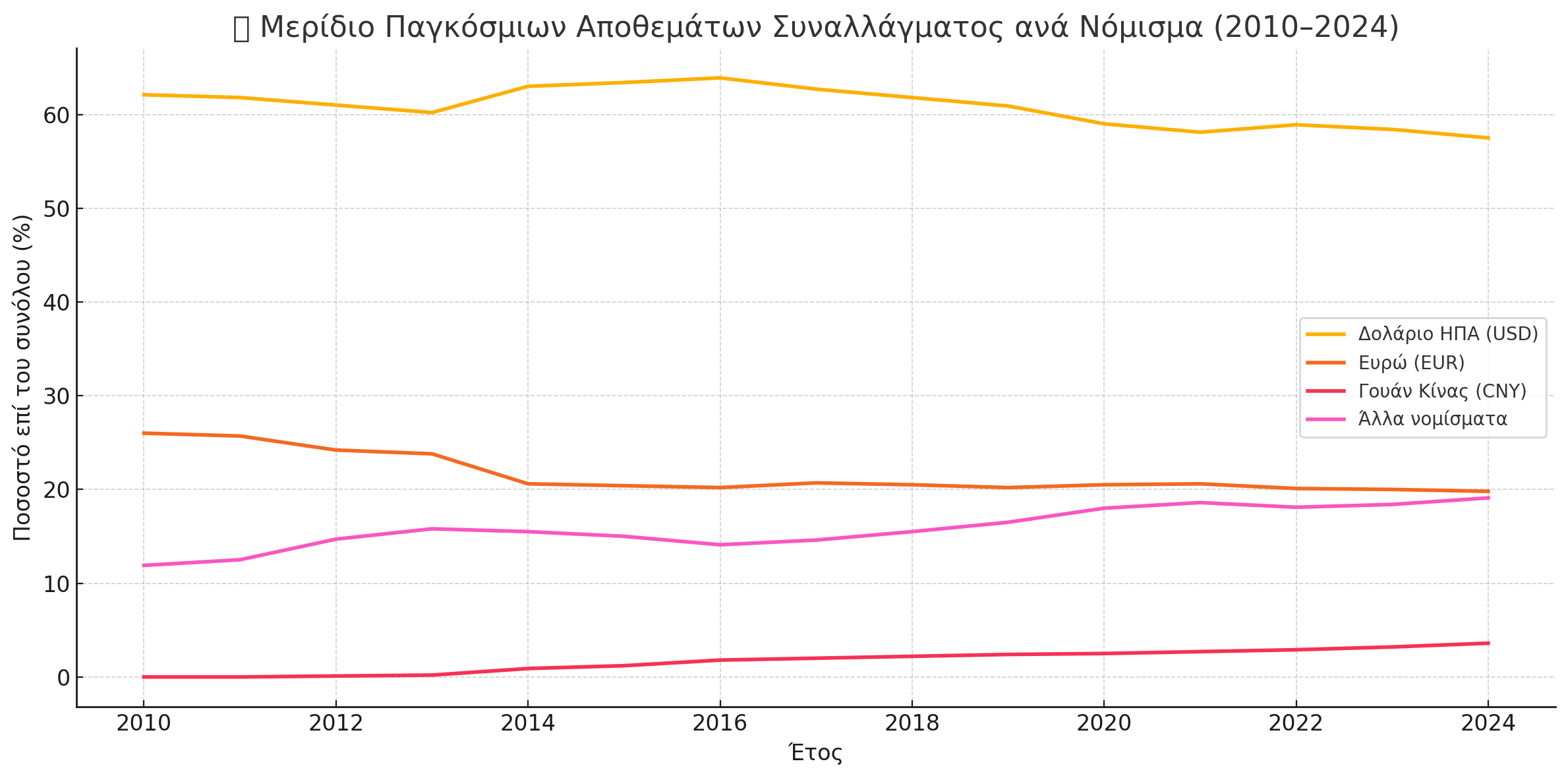 Να η γραφική απεικόνιση της εξέλιξης του μεριδίου των βασικών νομισμάτων στα παγκόσμια αποθέματα συναλλάγματος (2010–2024):