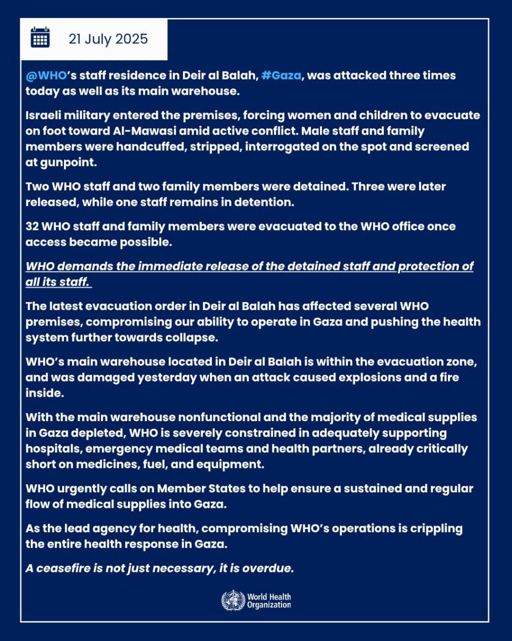 Ο Παγκόσμιος Οργανισμός Υγείας (ΠΟΥ) αναφέρει ότι το συγκρότημά του στην Ντέιρ αλ-Μαλάχ δέχτηκε επίθεση τρεις φορές μέσα σε μία ημέρα, με την κύρια αποθήκη να τίθεται εκτός λειτουργίας λόγω εκρήξεων και πυρκαγιάς. Σύμφωνα με τις πληροφορίες, Ισραηλινοί στρατιώτες ανάγκασαν γυναίκες και παιδιά να διαφύγουν πεζή, ενώ ακινητοποίησαν, έγδυσαν, έδεσαν και ανέκριναν το προσωπικό των εγκαταστάσεων υπό την απειλή όπλου.