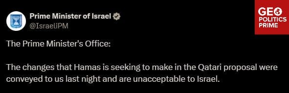 «Hamas' changes are UNACCEPTABLE» (Οι αλλαγές της Χαμάς είναι ΑΠΑΡΑΔΕΚΤΕΣ): Αυτή η δήλωση από την πλευρά του Ισραήλ είναι κεντρική. Υποδηλώνει ότι η Χαμάς έχει υποβάλει τροποποιήσεις στην αρχική πρόταση που είχαν διατυπωθεί από το Κατάρ (και υποστηρίζονταν από τις ΗΠΑ), και ότι αυτές οι τροποποιήσεις κρίνονται απαράδεκτες από το Ισραήλ.