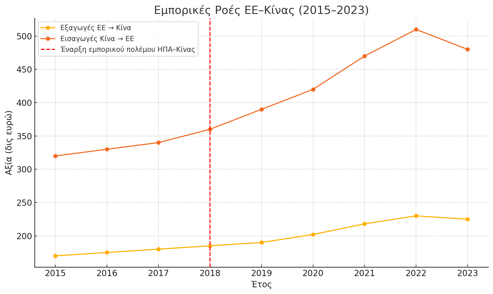 Το παραπάνω διάγραμμα δείχνει τη μεταβολή των εμπορικών ροών ΕΕ–Κίνας από το 2015 έως το 2023, με έμφαση στην περίοδο μετά το 2018, δηλαδή μετά την έναρξη του εμπορικού πολέμου ΗΠΑ–Κίνας. Μερικά βασικά σημεία: