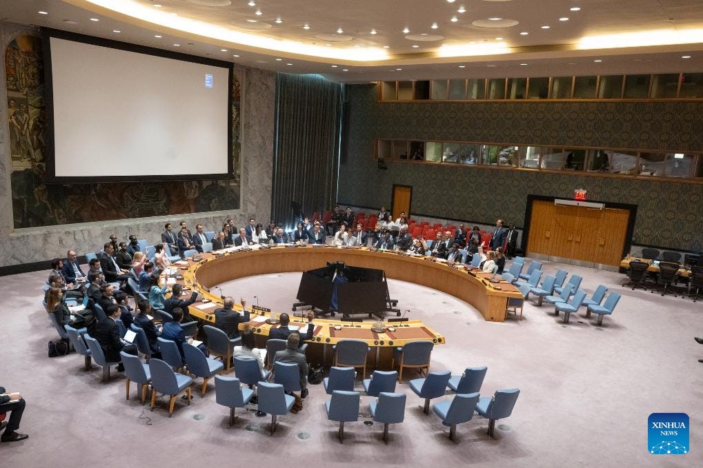 Εκπρόσωποι ψηφίζουν ένα σχέδιο ψηφίσματος κατά τη διάρκεια συνάντησης του Συμβουλίου Ασφαλείας στα κεντρικά γραφεία του ΟΗΕ στη Νέα Υόρκη, στις 29 Ιουλίου 2025. Το Συμβούλιο Ασφαλείας του ΟΗΕ (UNSC) την Τρίτη υιοθέτησε ένα ψήφισμα για την παράταση για ένα χρόνο, έως τις 31 Ιουλίου 2026, των κυρώσεων κατά των ενόπλων ομάδων που δρουν στην Κεντροαφρικανική Δημοκρατία (ΚΑΔ), καθώς και άλλων ατόμων που υπονομεύουν την ειρήνη στη χώρα.