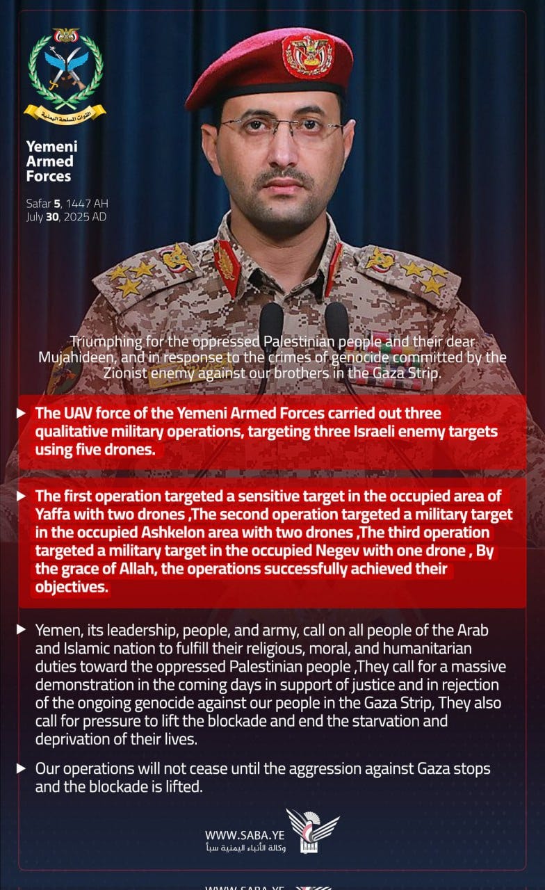 Ο εκπρόσωπος του κινήματος Ansar Allah, Γιαχία Σαρί, ανακοίνωσε ότι οι δυνάμεις μη επανδρωμένων αεροσκαφών της Υεμένης πραγματοποίησαν τρεις επιχειρήσεις με drones εναντίον ισραηλινών στόχων, σε απάντηση για τα «εγκλήματα γενοκτονίας» στη Γάζα